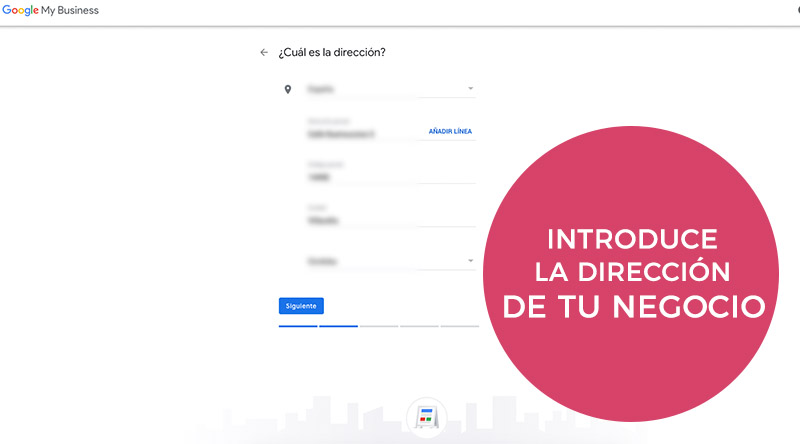 A continuación debes introducir la dirección de tu negocio. ¡Ten cuidado! Esta información ha de ser exacta para que a los usuarios les resulte fácil encontrar tu negocio a través de Google Maps.